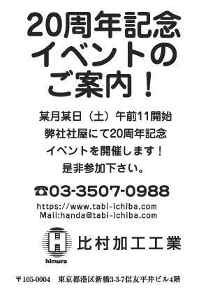 創業20周年のイベントのご案内チラシの印刷デザインです。