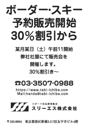 ボーダー、スキーを専門に扱っているスリーエス様の予約展示販売のイベントの開催のご案内チラシ印刷デザインです。このチラシでさらに30%割引です。